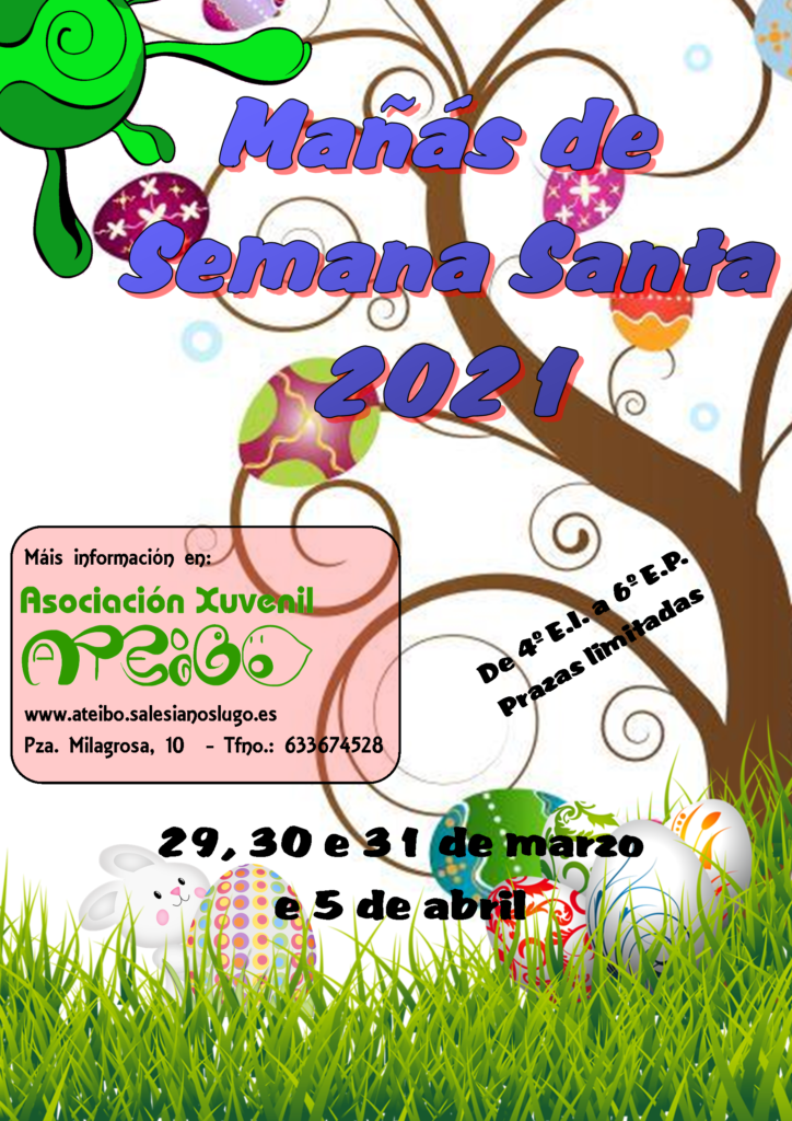 Mañás de Semana Santa é unha actividade para facilitar que se poida conciliar a vida familiar e laboral nos tempos de vacacións dos/as nenos/as. Os obxectivos son educar en valores a través do xogo, ofertar actividades alternativas á televisión ou consolas, favorecer a creatividade dos/as nenos/as, a participación e o traballo en equipo, e poder seguir empregando as instalacións colexiais fóra do horario escolar.